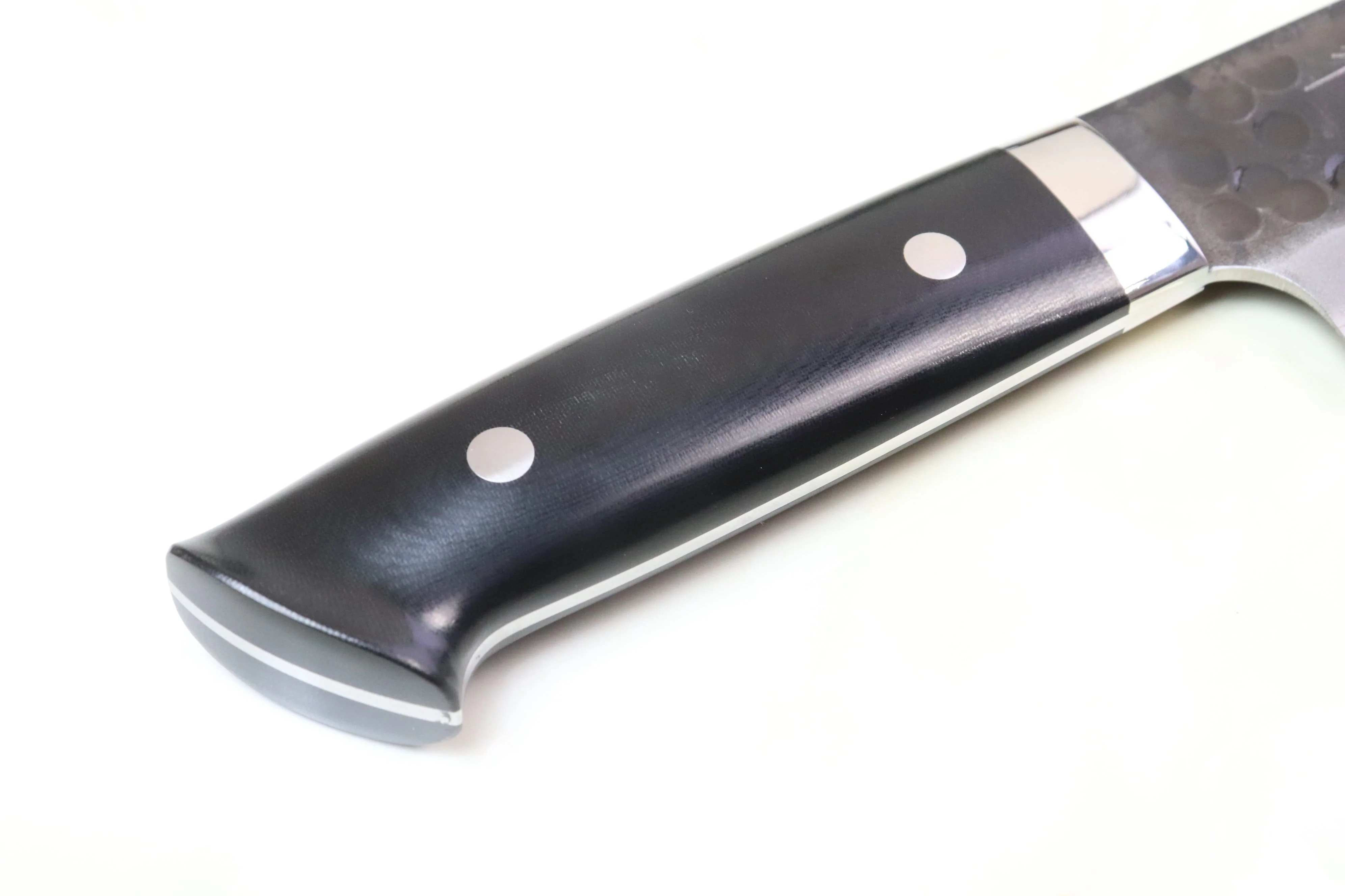 The “Aogami Super Black Forged Knife” has a blade core of Aogami Super that is sandwiched between two layers of corrosion-resistant soft stainless steel. The laminated blade is decorated with a Tsuchime (“Hammered pattern”) texture and a traditional Japanese Kurouchi (“Literally, “Black-forged”) finish that ads a touch of rustic style. This knife is available with black linen Micarta® handle scales that beautifully match the black and grey tones of the Kurouchi finish or ‘Linen Micarta® is a very practical handle material for kitchen knife because it is very durable, resistant to both water and shrinkage and provides good traction even when it is wet. The handle is carefully contoured by hand to ensure that it can be gripped comfortably and are fitted with a stainless steel bolster for improved durability and blade balance.