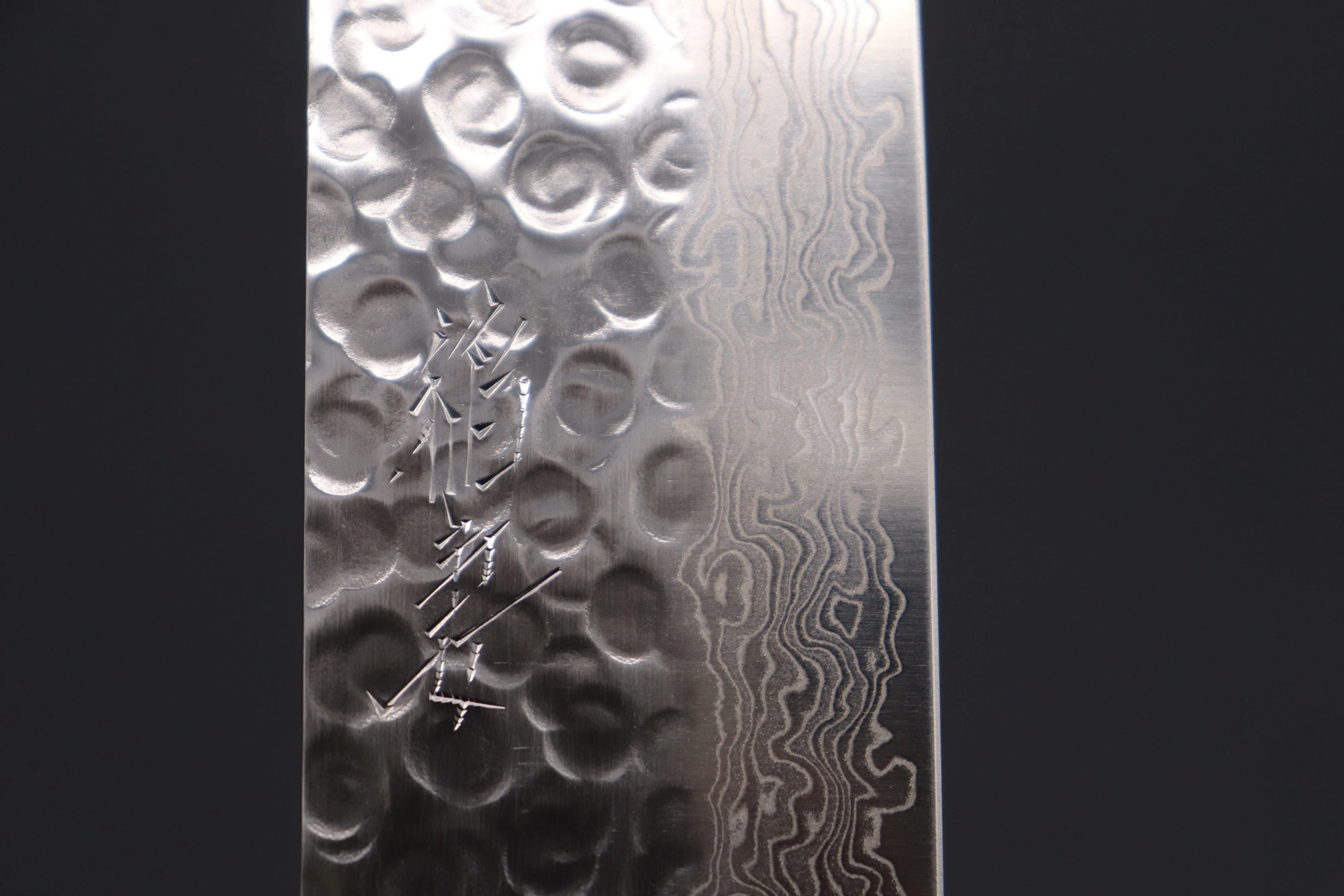 Inazuma knife has a unique & beautiful Tsuchime (“Hammered pattern”) textured Damascus blade. This knifefeatures a hand sharpened and hand honed AUS-10 Nickel Damascus stainless steel blade (HRc. 60-61. 50/50 symmetrically ground double beveled edge).
