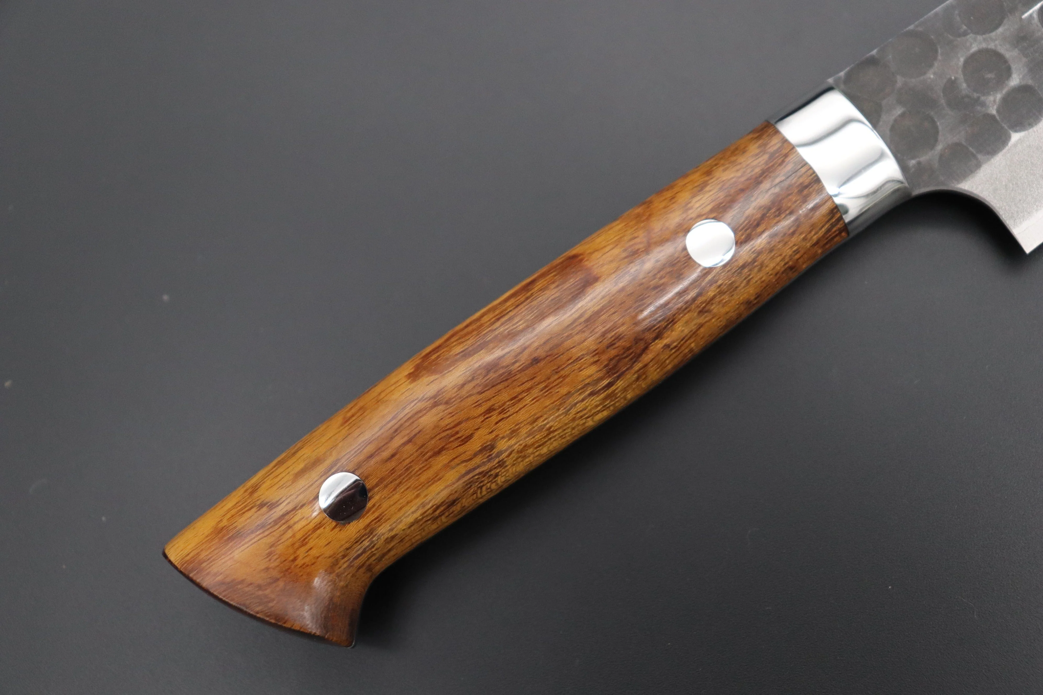 The “Aogami Super Black Forged Knife” has a blade core of Aogami Super that is sandwiched between two layers of corrosion-resistant soft stainless steel. The laminated blade is decorated with a Tsuchime (“Hammered pattern”) texture and a traditional Japanese Kurouchi (“Literally, “Black-forged”) finish that ads a touch of rustic style. This knife is available with Ironwood’ handle scales that have a rich warm color and dramatic figuring.